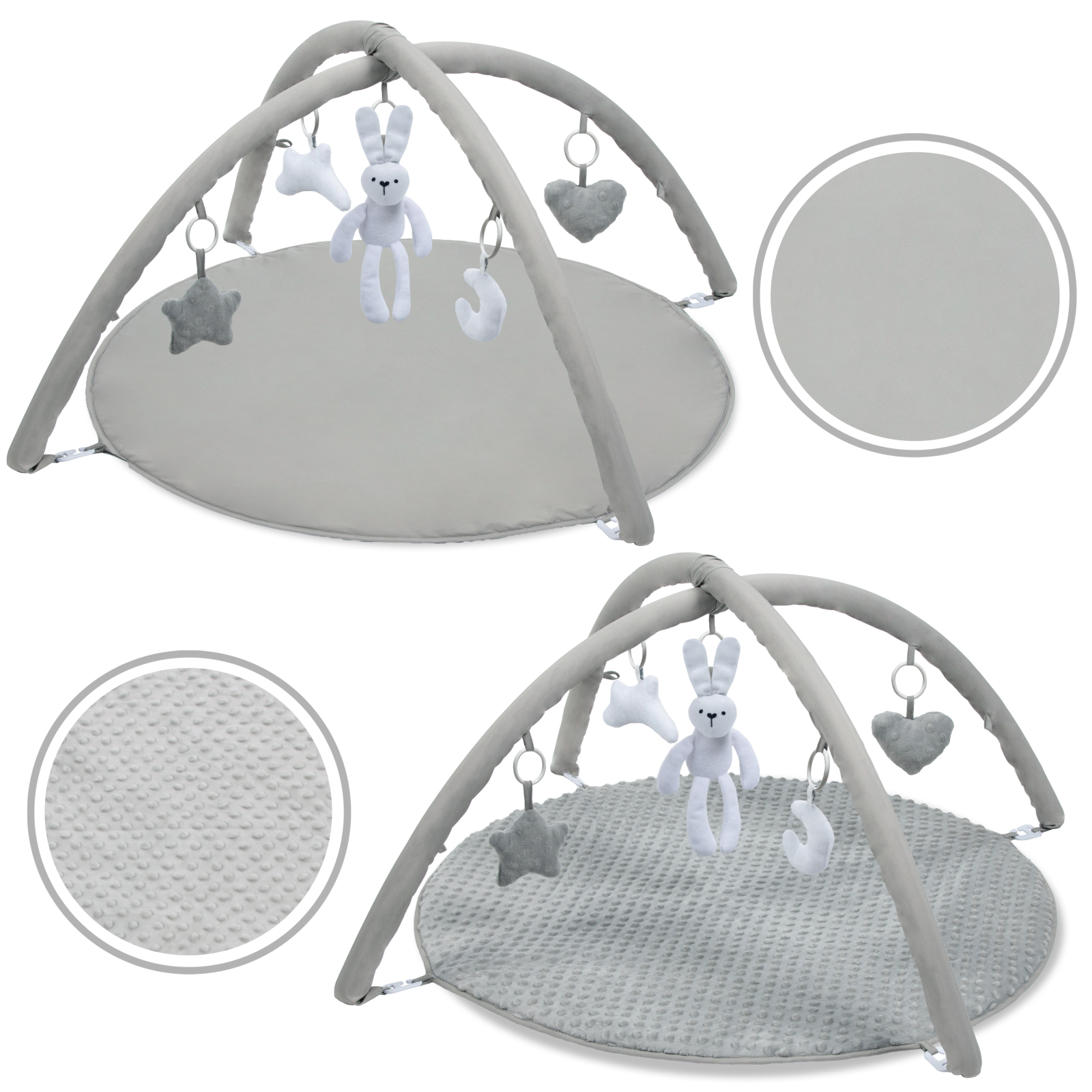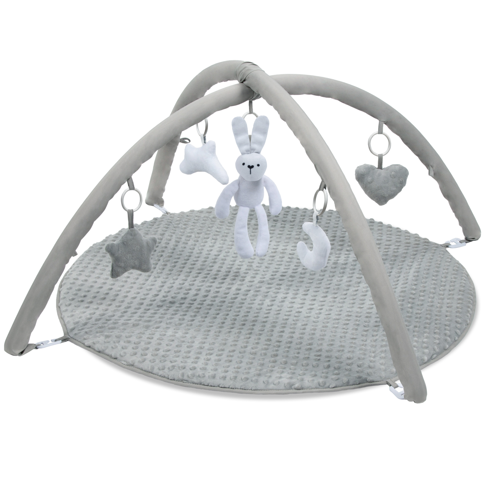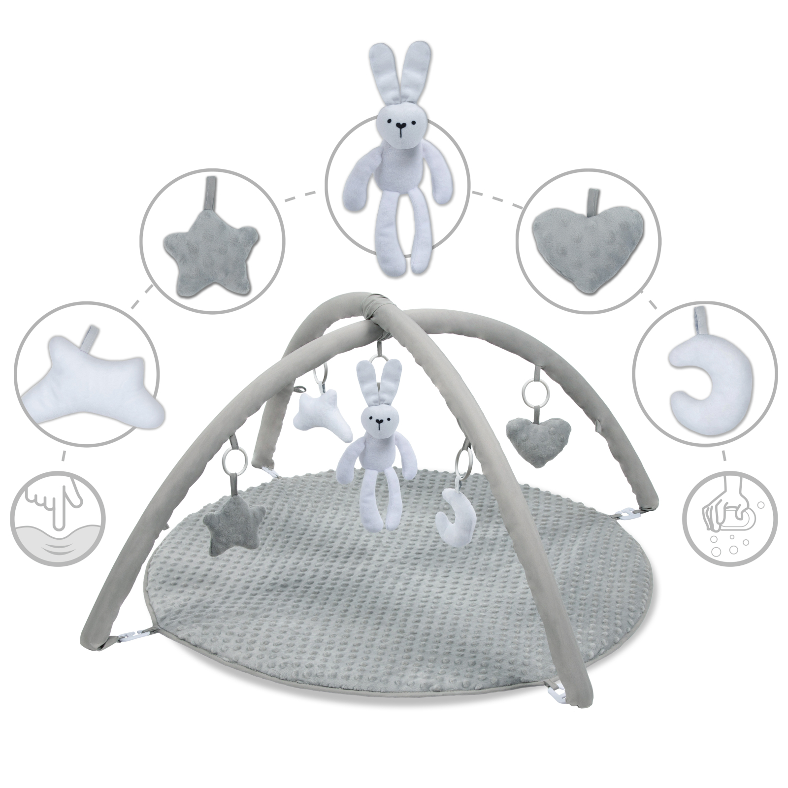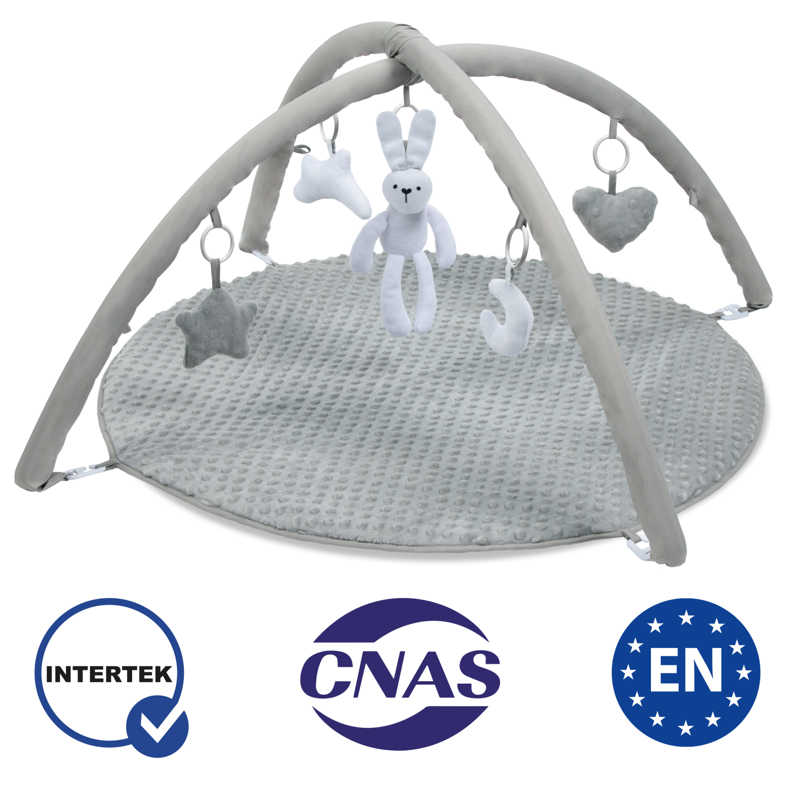 Este spațiul de joacă perfect pentru bebelușii care abia încep să exploreze lumea. Covorașul de joacă poate fi un companion pentru copilul dumneavoastră încă din primele zile de viață. Jucăriile moi, de pluș, încurajează copilul să observe, să atingă și să asculte. Jucăriile de pluș pot fi ajustate pentru a se potrivi nevoilor individuale ale copilului dumneavoastră și așezate pe arcade în nouă poziții diferite.