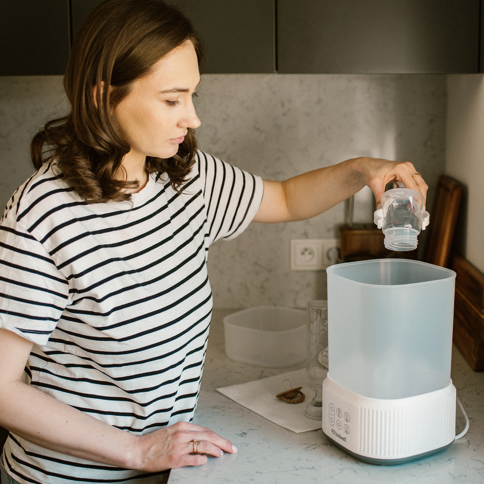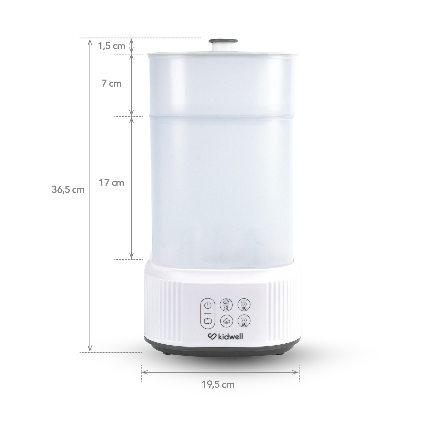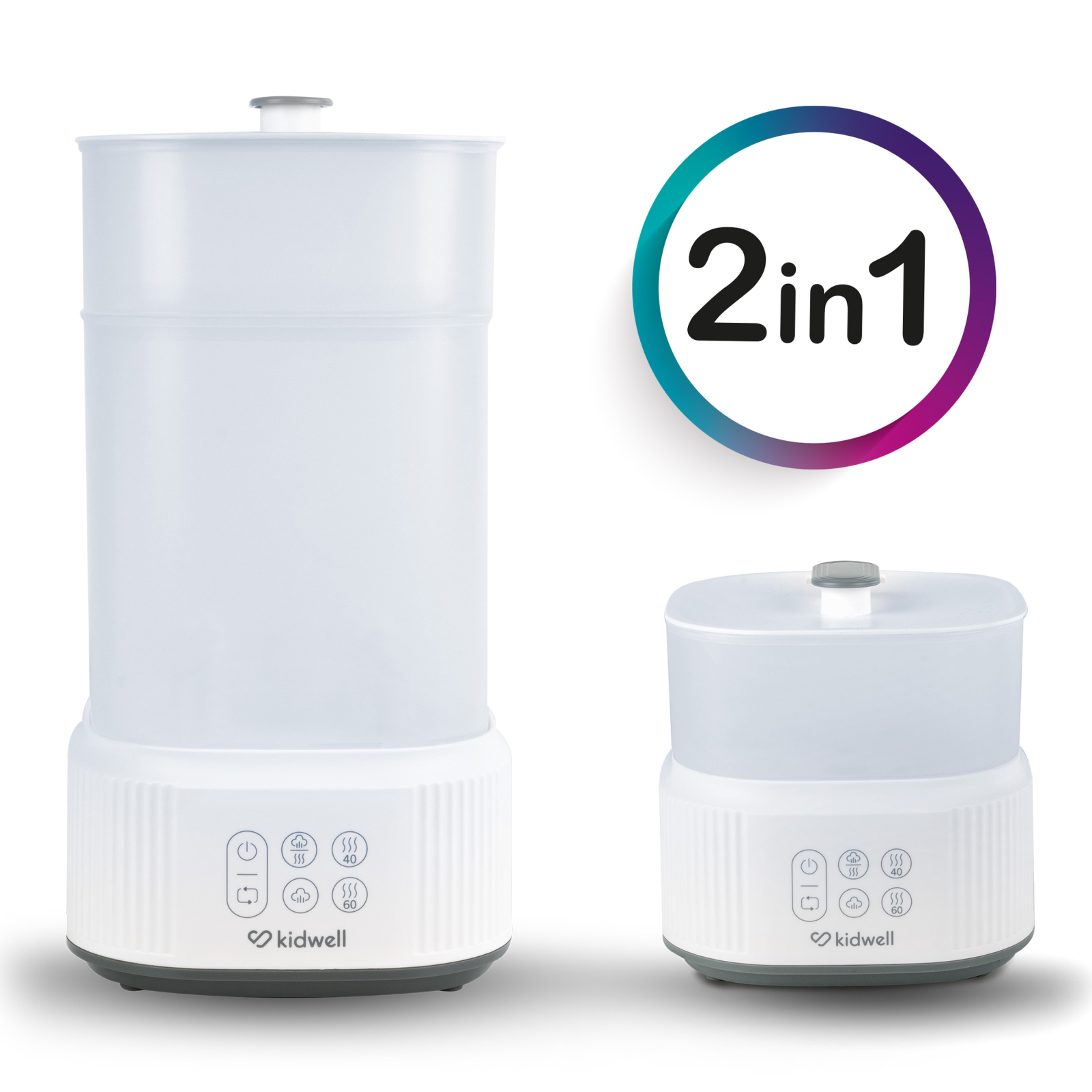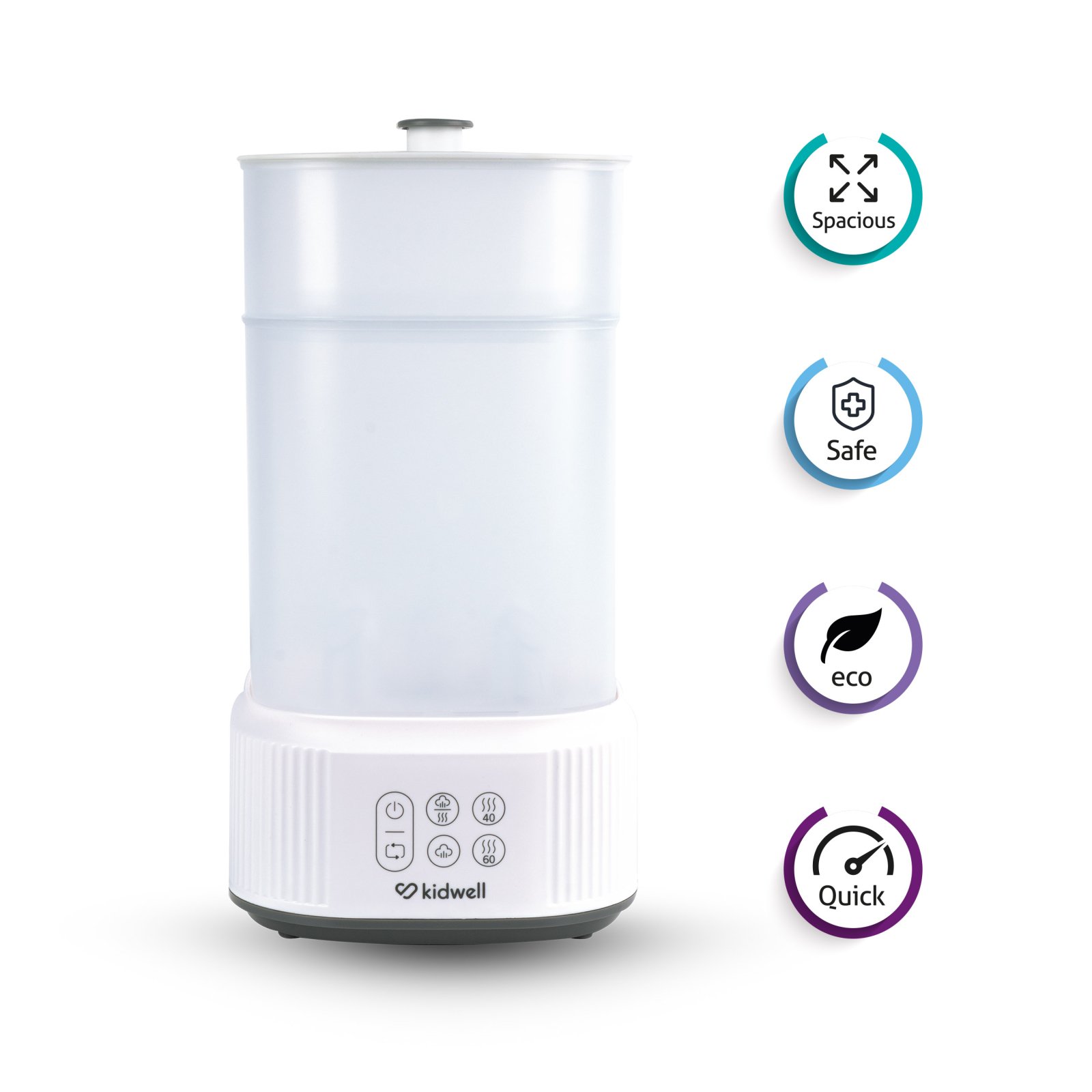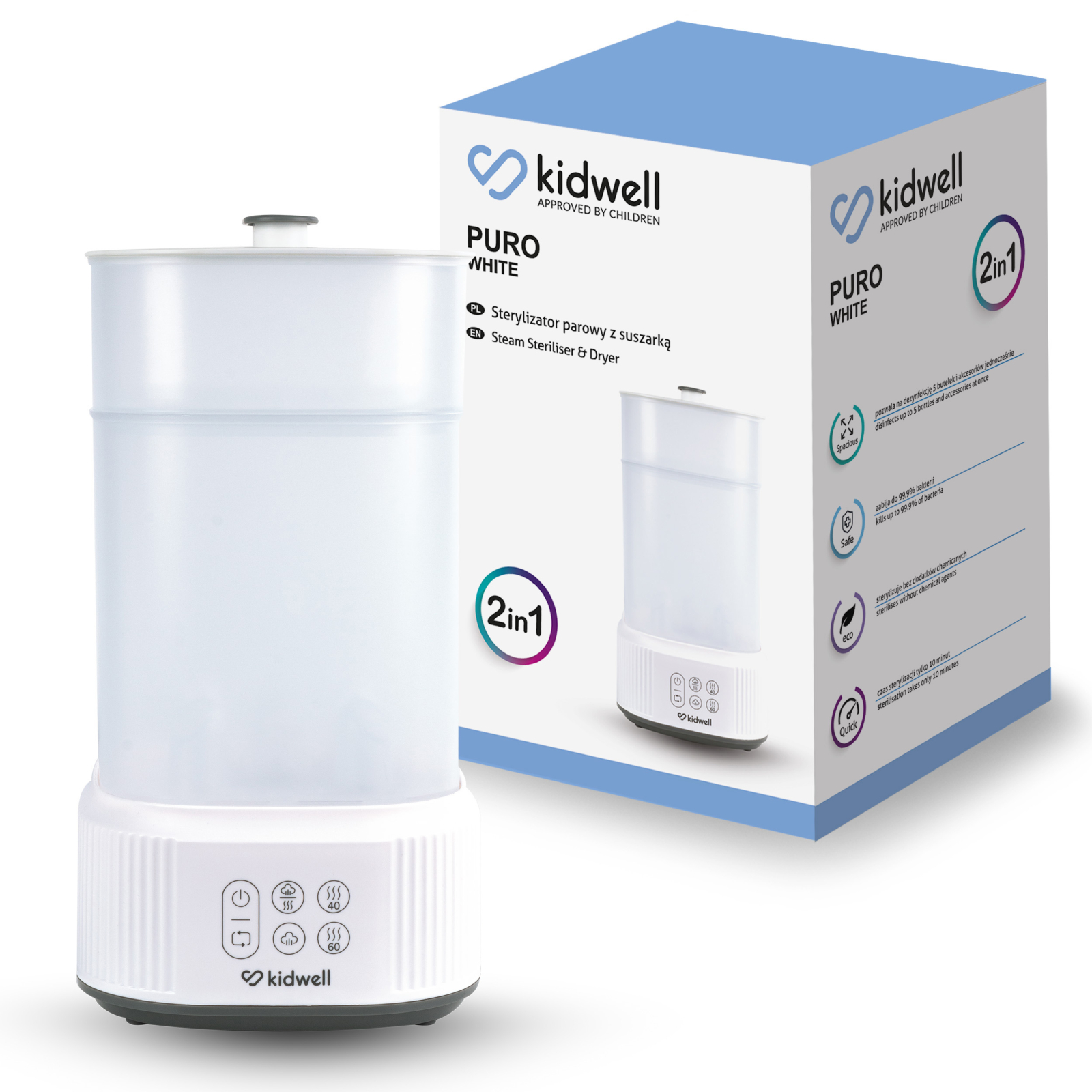 Kidwell Puro este un dispozitiv multifuncțional care poate fi utilizat în diverse moduri  – pentru sterilizare și uscare, doar pentru sterilizare sau doar pentru uscare. Poate fi folosit și ca spațiu de depozitare pentru biberoane și accesorii.