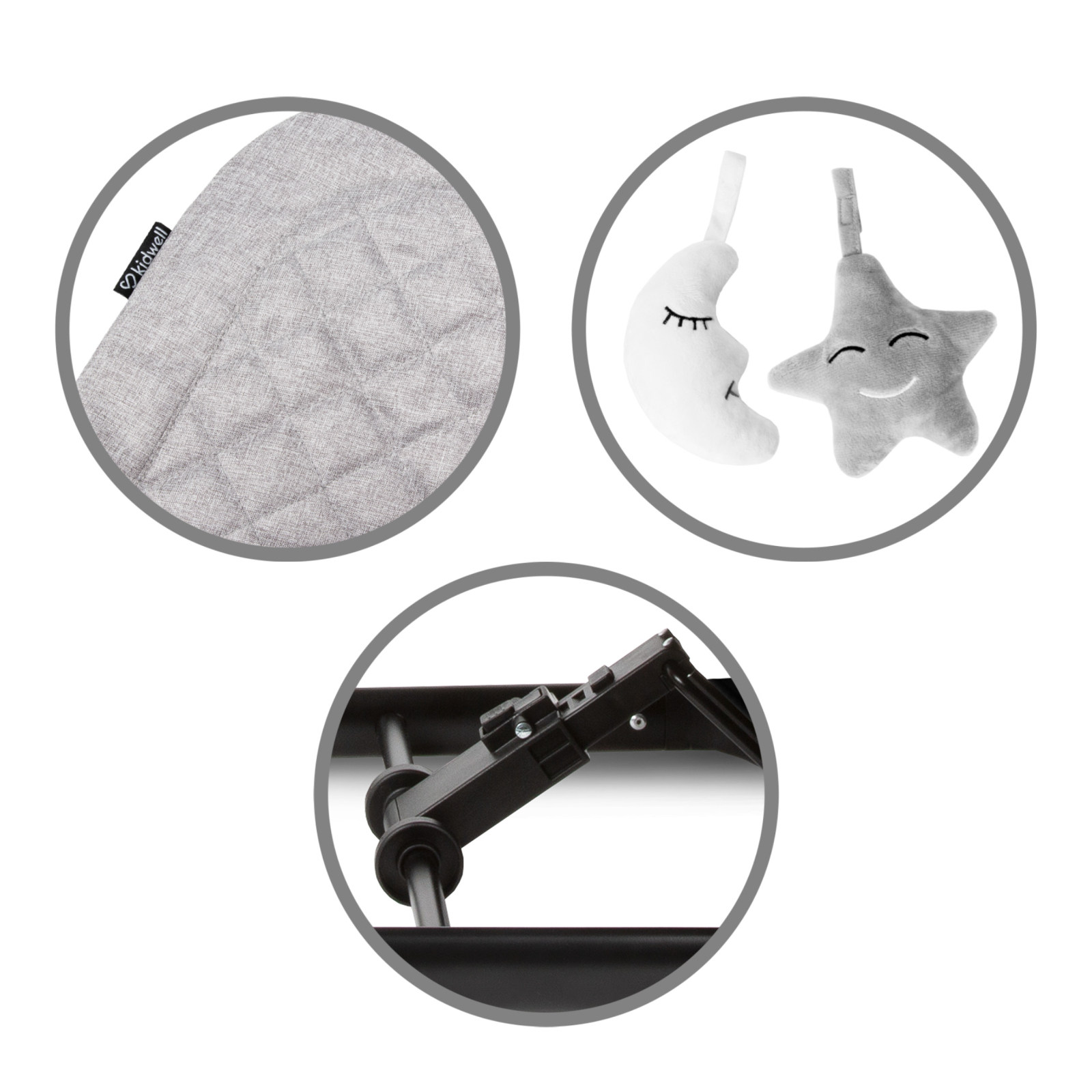 • Bară de jucării detașabilă cu două jucării detașabile,