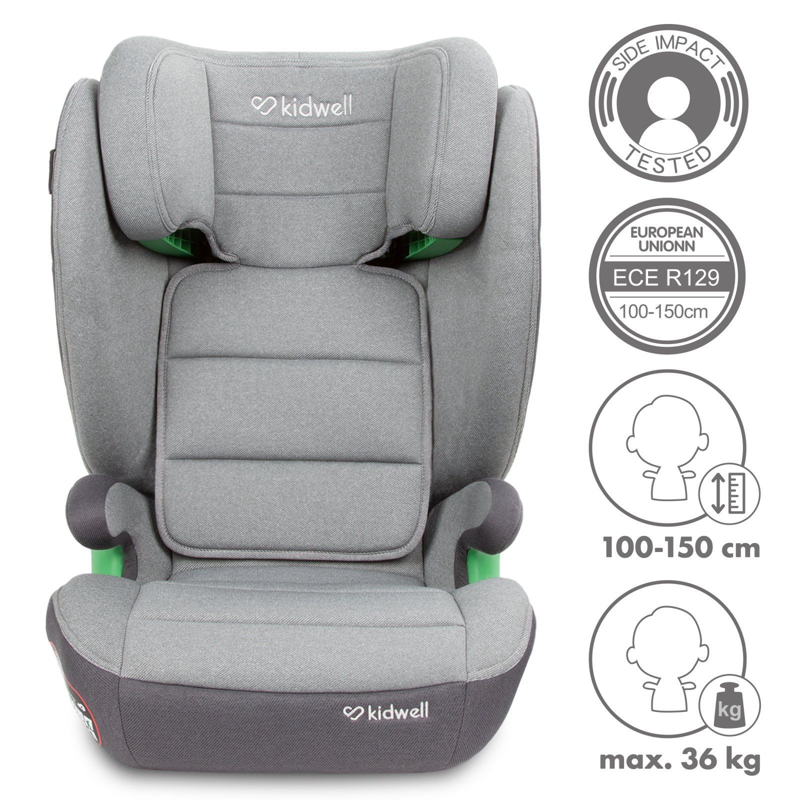 Omologare i-SizeScaunul auto Kidwell WESTON este o garanție a siguranței și a calității înalte. Marcajul i-Size este rezervat scaunelor care îndeplinesc cel mai actual și strict standard european de siguranță. Omologarea R129 (cunoscută în mod obișnuit ca i-Size) asigură o protecție îmbunătățită pentru capul, gâtul și umerii copilului, confirmată de teste riguroase de impact.Un scaun fiabil care va rezista ani de zileScaunul Kidwell Weston este conceput pentru copii cu înălțimea cuprinsă între 100 și 150 cm . Datorită reglării înălțimii tetierei pe mai multe niveluri, produsul crește odată cu copilul și poate fi utilizat cu succes de la 3 până la aproximativ 12 ani.Instalare intuitivă și simplă, orientată spre față