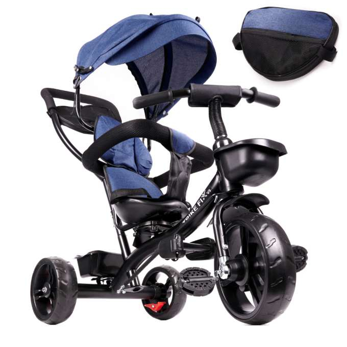 • Tricicletă pentru copii cu coșuleț. Dispune de scaun rotativ si bară extensibilă . Copertina din plasă cu 3 etape protejează copilul de soare. Pliată, ocupă foarte puțin spațiu. Fabricație robustă garantează siguranța. Culoare: albastru marin.